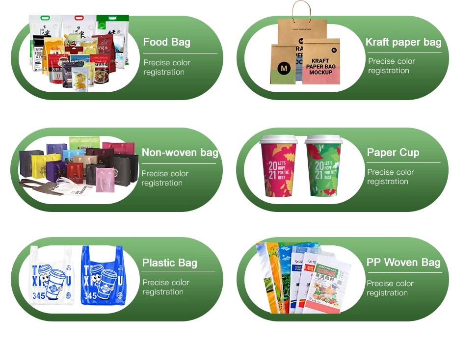 PE, BOPP, PET, CPP, kağız və digər çevik substratlar üçün uyğundur, qida qablaşdırması, alış-veriş çantaları, etiketlər və müxtəlif çevik qablaşdırma çapı üçün idealdır.